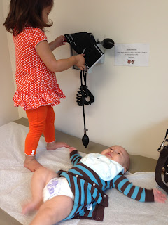 Esme trying to take baby Chan's blood pressure at the doctors office